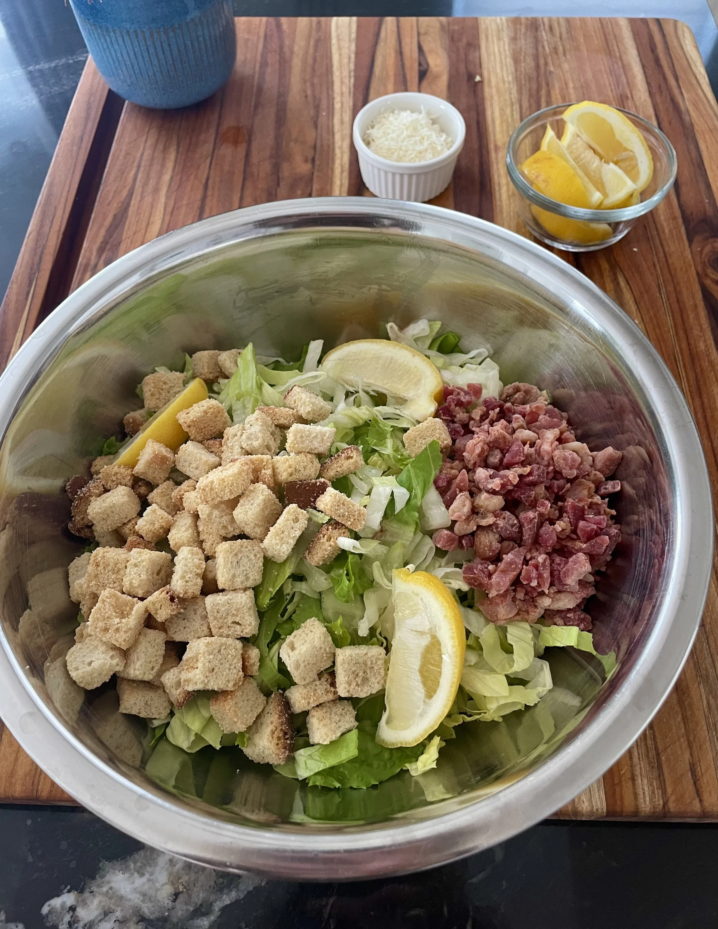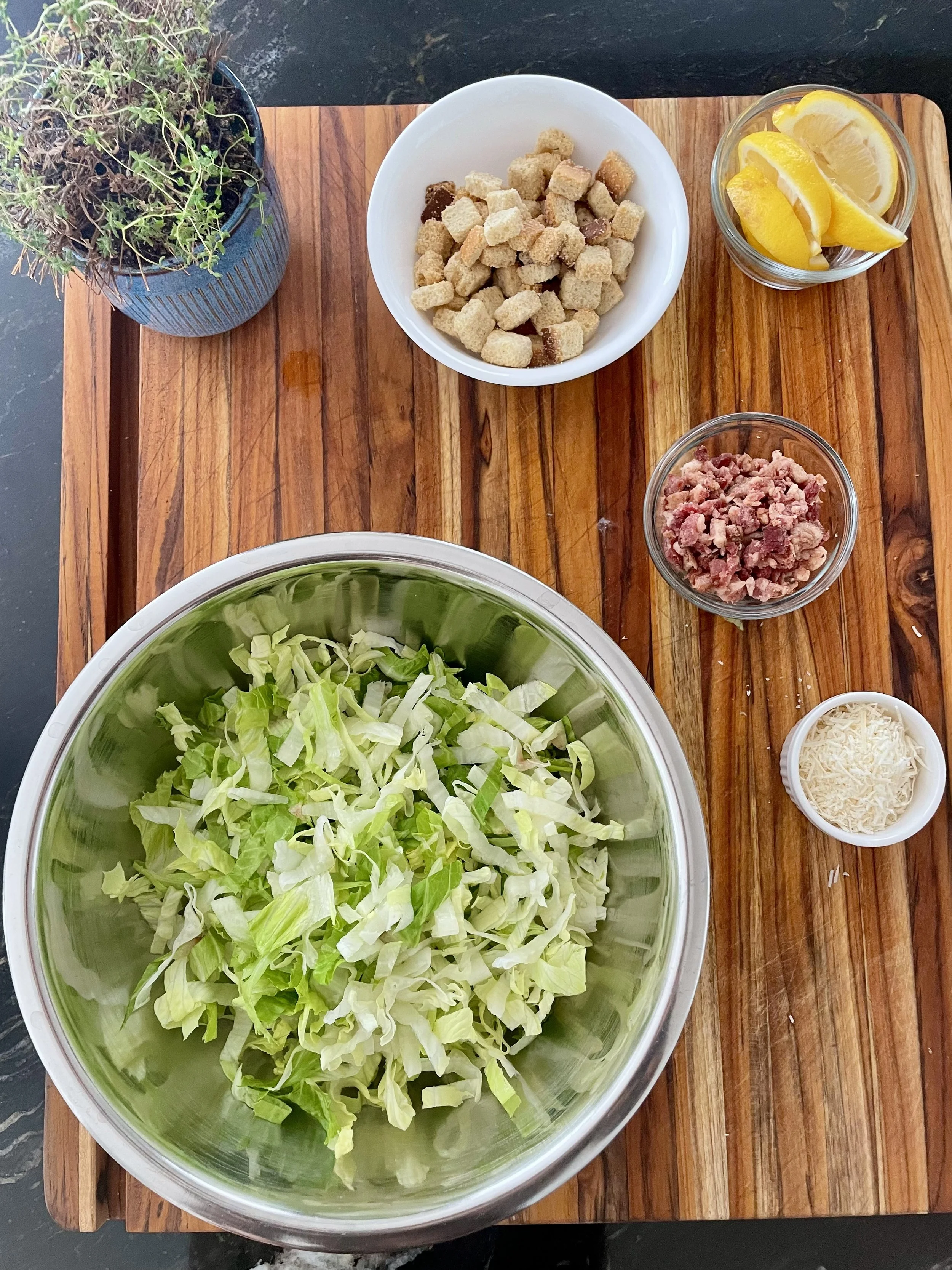 Gather all of the ingredients: the romaine lettuce, bacon bits, parmesan, croutons in one big salad bowl.