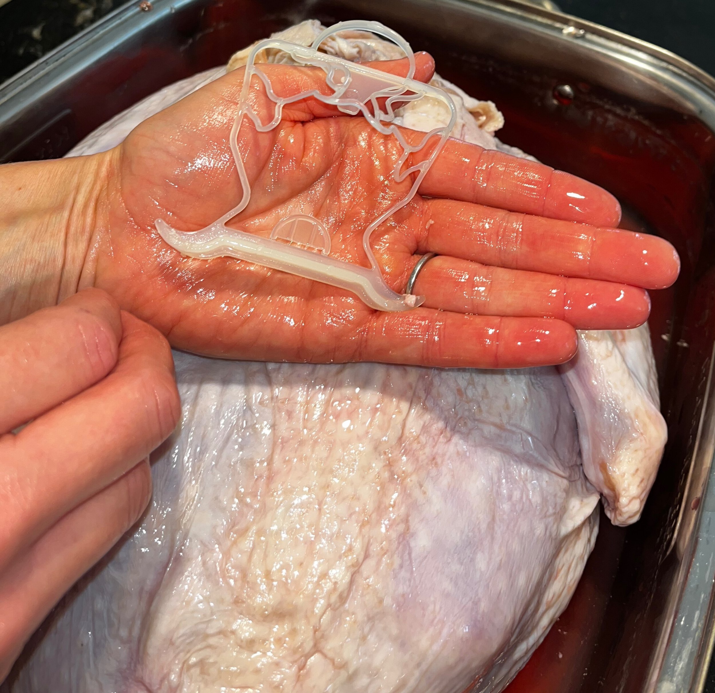 With clean hands, remove the plastic hook that’s hooked on the inside of the turkey legs, the neck and bag that contains the heart and liver from the turkey cavity.